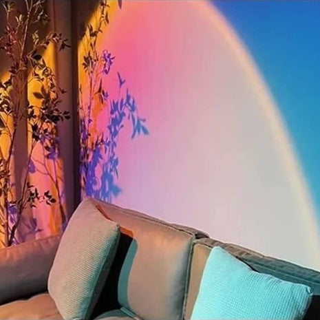 Lampan använder en stark LED-ljuskälla och en speciell lins som projicerar en cirkel av ljus mot vägg eller tak, vilket skapar en solnedgångs- eller regnbågseffekt i rummet. Du riktar bara lampan dit du vill ha effekten och justerar färg och läge med fjärrkontrollen